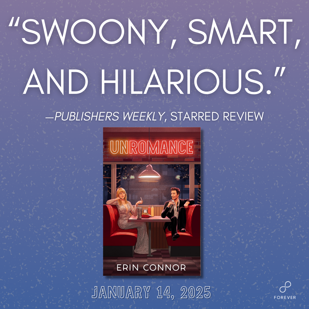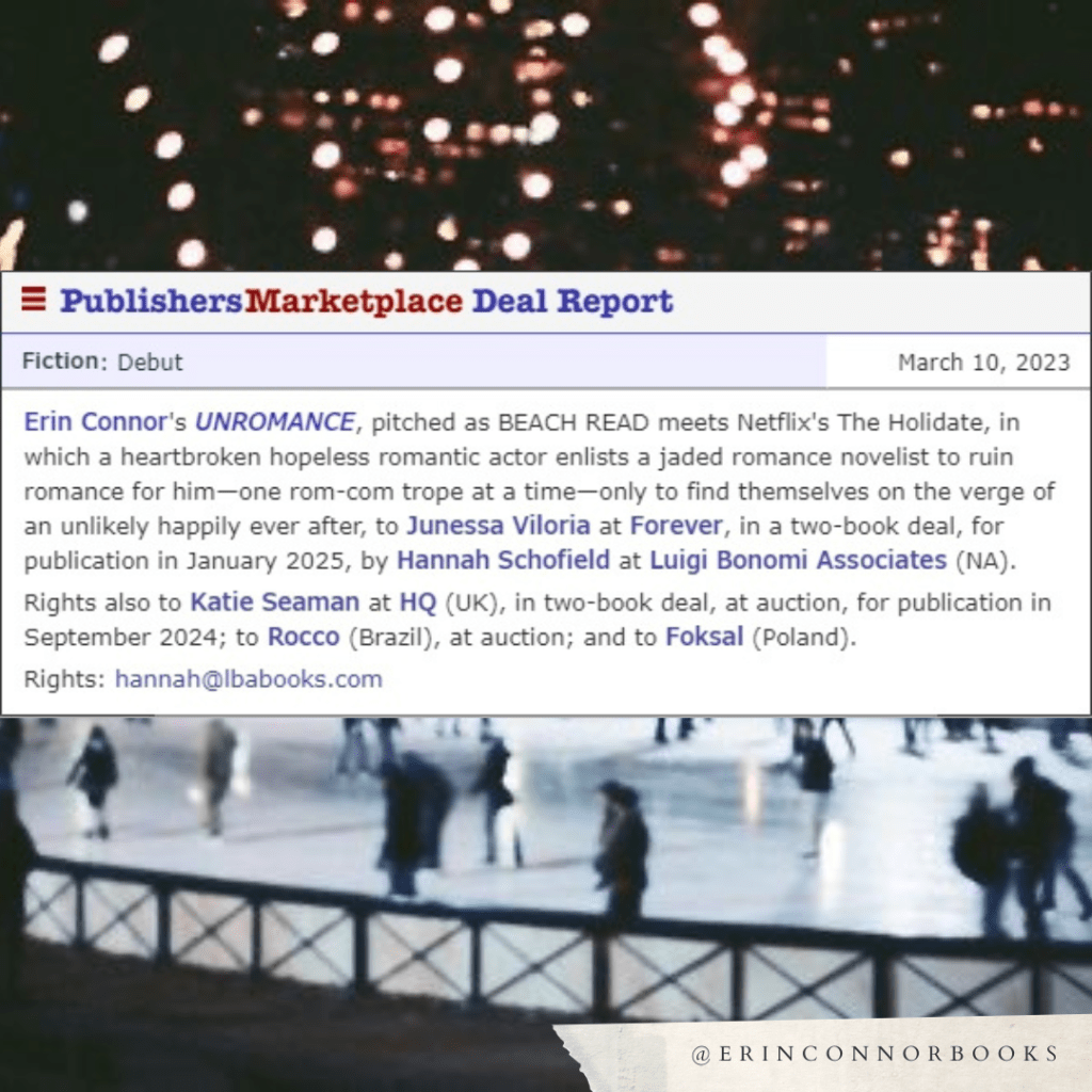 “Erin Connor’s UNROMANCE, pitched as BEACH READ meets Netflix’s The Holidate, in which a heartbroken hopeless romantic actor enlists a jaded romance novelist to ruin romance for him–one rom-com trope at a time–only to find themselves on the verge of an unlikely happily ever after, to Junessa Viloria at Forever, in a two-book deal, for publication January 2025, by Hannah Schofield at Luigi Bonomi Associates (NA).